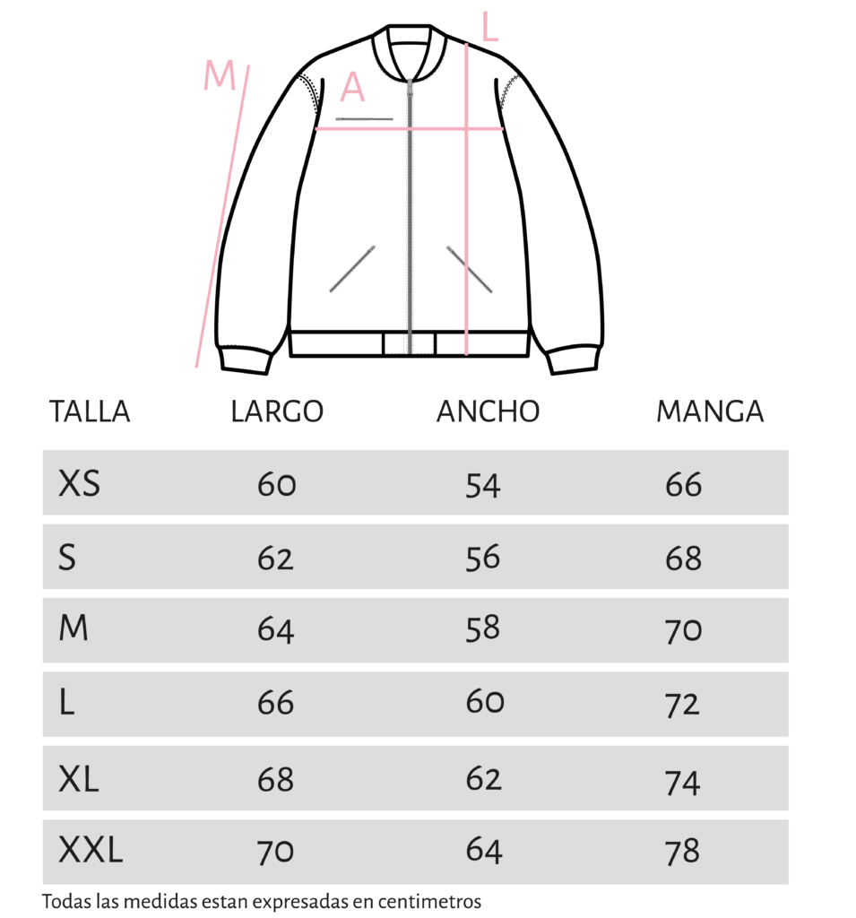 Manejamos tallas de la XS a la XXL, con estas medidas para que puedas elegir el mejor fit para tu estilo.